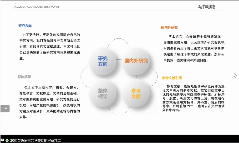 20级英语语言学方向李佳璐同学分享的主题为“教你写好毕业论文”。她从确定选题、查找材料、文档下载、阅读和整理材料、正式行文等方面讲解了学位论文撰写、行文框架和写作技巧,鼓励大家读研期间自主学习、惜时如金,做自己学术研究中的英雄。