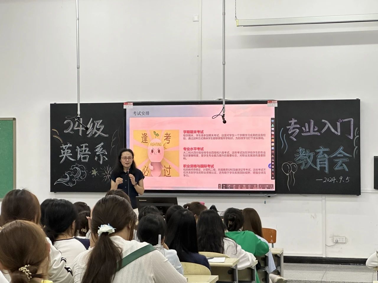 为了帮助新生增强专业认同感,树立专业自信,并做好学业规划,以便更好地适应即将到来的大学生活,9月5日,英语系在11114教室举办了新生专业介绍会。系主任胡晓丽出席并主持会议,全体新生及部分班代参加会议。