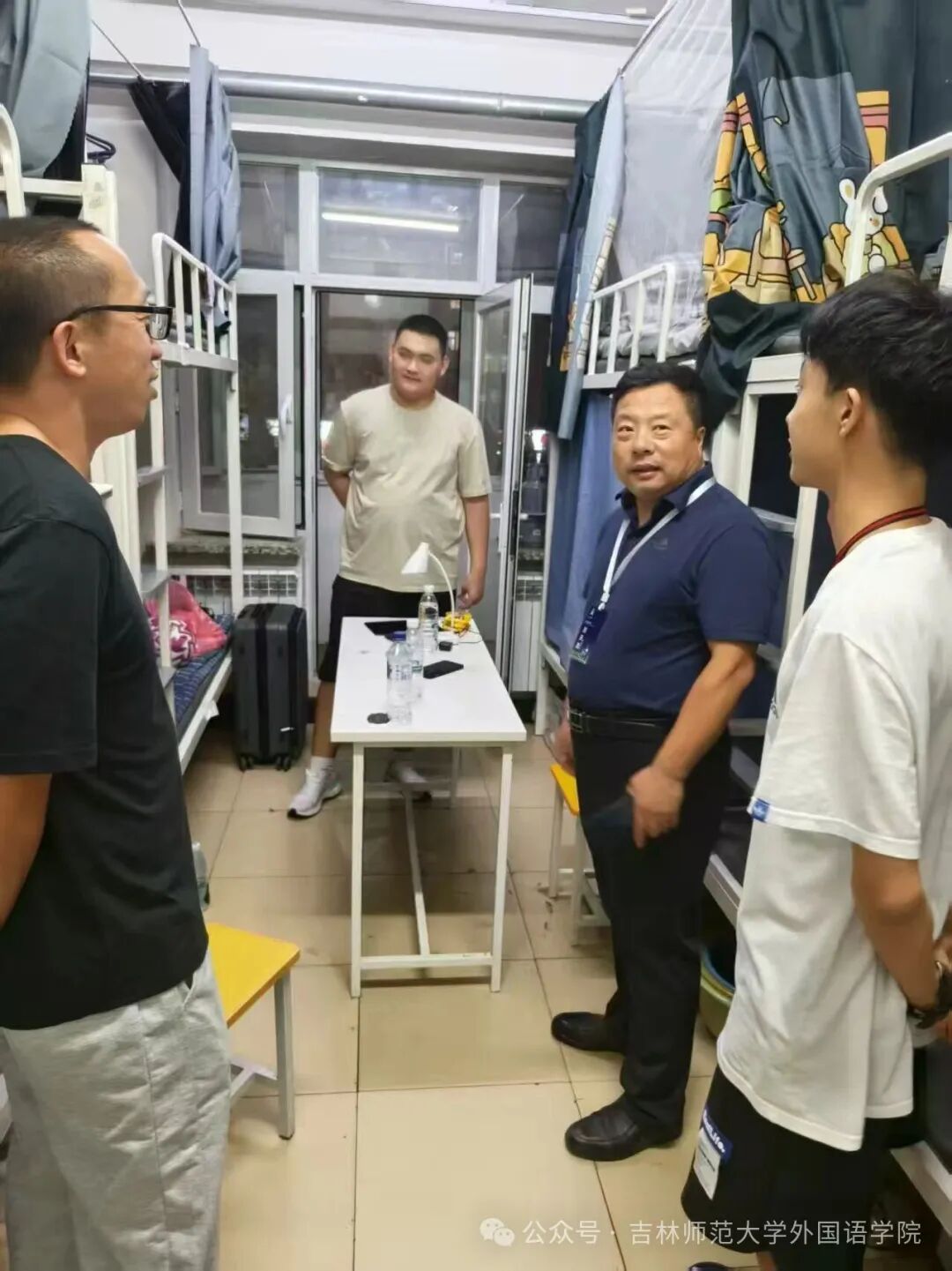 为保障 2025 级新生安全有序入住,及时了解入学适应情况,传递学院关怀与温暖,8 月 30 日晚,外国语学院组织开展新生寝室夜间走访活动。党委书记刘天浩带队,副书记胡晶,副院长赵岩、李艳红、于博,院办副主任王一涵,团委副书记范妙然,学工办副主任毛健萍及辅导员陈建飞、柳铭钰、刘心竹深入新生宿舍走访慰问,将学院的牵挂与暖意送到每一位新生身边。