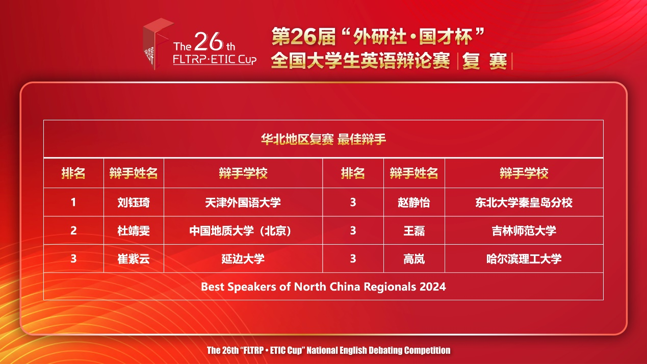 2023年3月30日-3月31日,第二十六届“外研社·国才杯”全国大学生英语辩论赛华北赛区复赛在线上举办,来自华北赛区的88支队伍参加了本次赛事。我院2020级本科生王磊和2022级本科生傅裕组成的辩论队在刘冬霞老师的带领下经过5轮角逐,最终以第10名的成绩成功晋级全国决赛,我校成为吉林省唯一晋级全国决赛的院校,王磊同学获得了华北赛区的最佳辩手,彰显了我院学生的风采。