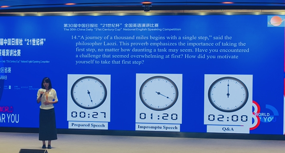我院2022级英语专业张馨予同学(指导教师:刘冬霞)在“命题演讲”“即兴演讲”和“即兴问答”三个环节中沉着应变,表现出色,最终取得了一等奖第一名的好成绩,并晋级全国决赛。这是我校目前在该项赛事上取得的最好成绩,实现了近些年该项赛事晋级国赛零突破。