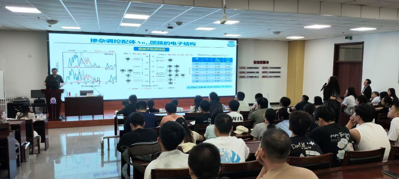 讲座伊始,赵教授提出“光与材料的相互作用是一个复杂而多样的过程,涉及电磁波与材料内部的量子态和集体激发的相互作用。相比其他物理化学性质,材料光学性质的第一性原理模拟计算更具有挑战性。”随后,赵教授结合团队的实验数据,用通俗的语言解释复杂概念,研究团队利用Gaussian、VASP等程序,基于量子限域效应、元素掺杂、官能团修饰、结构设计(多聚体、Janus、异质结)等调控策略,设计了一系列低维光学功能材料。研究内容主要包括:配体金团簇和富勒烯的荧光调控;手性硒化镉量子点的光活性;二维单层材料及异质结的非线性光学性质;二维反铁磁材料 Fe,CX,(X=F,CI)的磁光克尔效应。