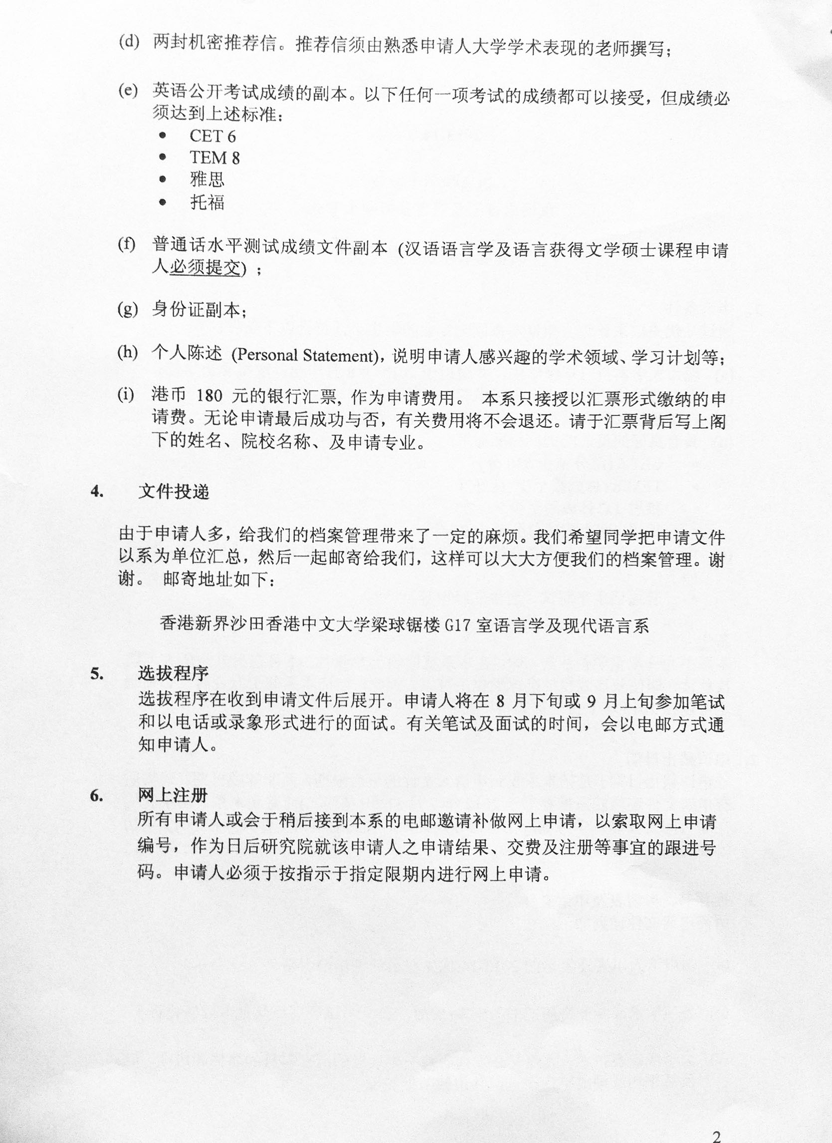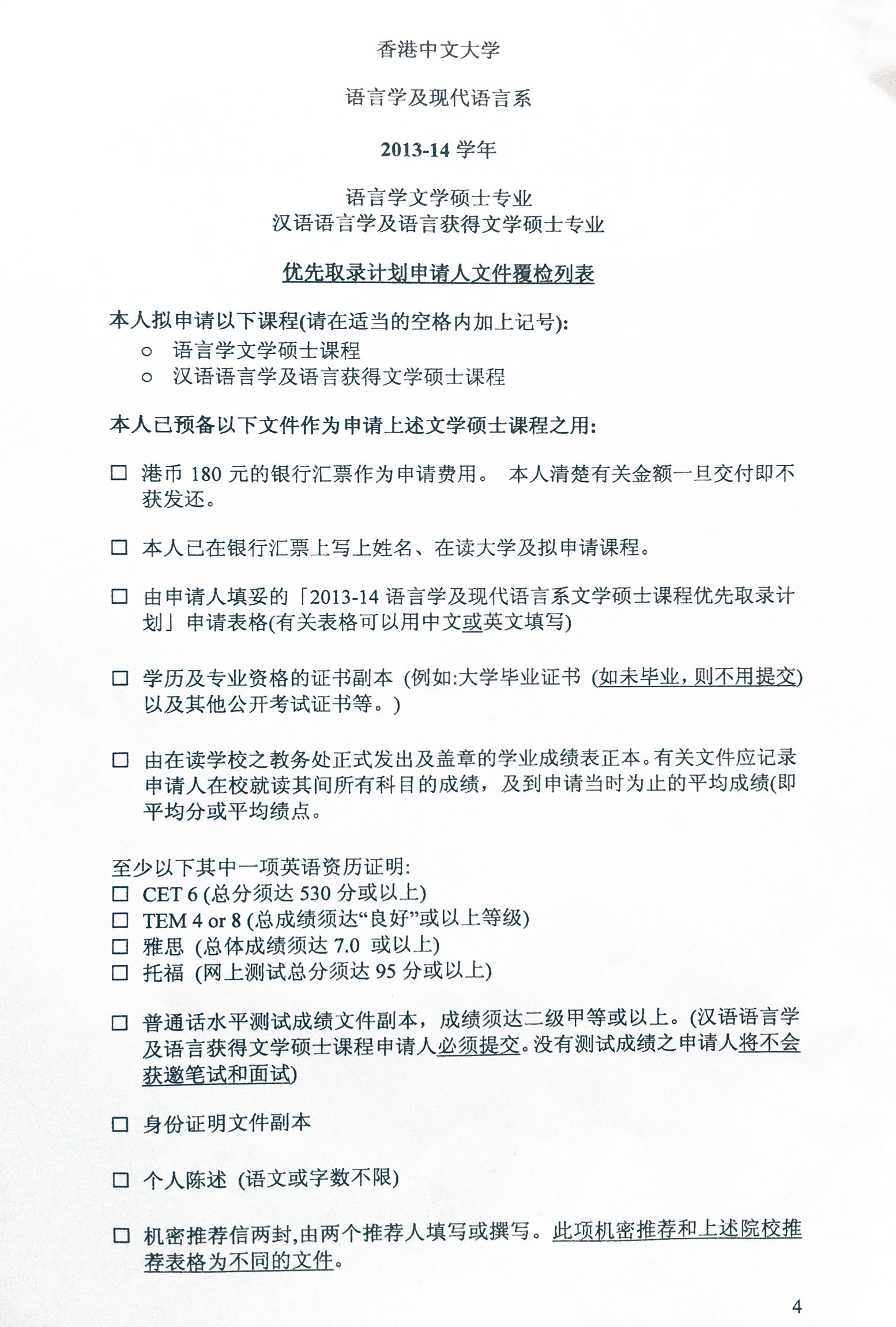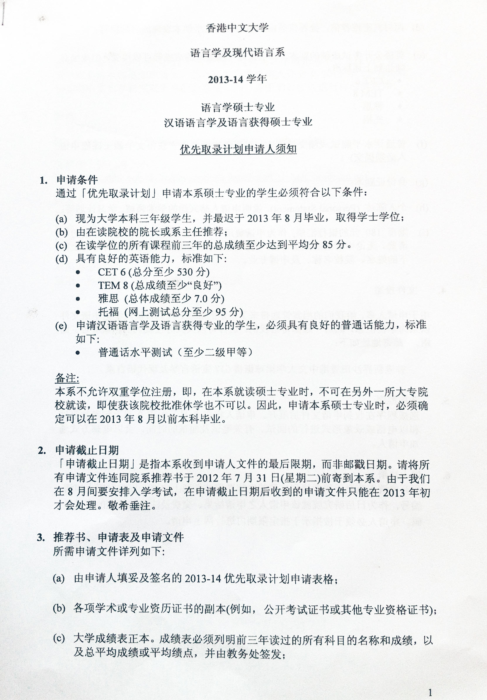 香港中文大学语言学及现代语言系“语言学专业硕士、汉语语言及语言获得硕士专业”优先取录计划申请人须知: