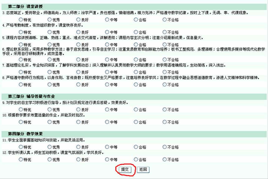 选择完所有的选项后,点击提交按钮,即可完成本次网上评教工作。