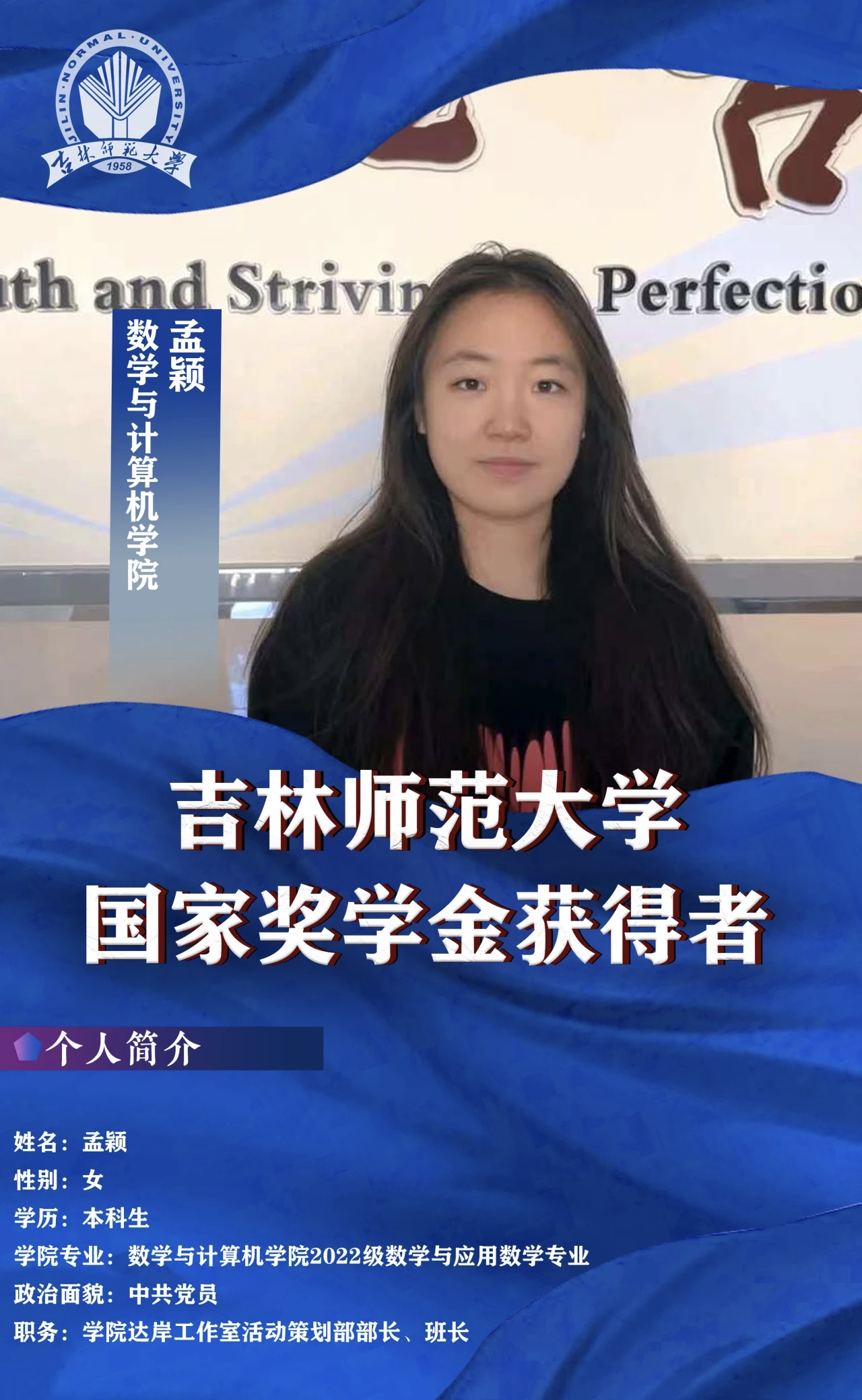 作为一名数计学子,姜源靖深刻领悟“好学近知,力行近仁”的校训内涵,并以此作为自己的人生信条。在大学的三年里她一直勤奋学习,挑战自我,在青春赛道上努力跑出最好成绩,立志成为一位用爱育人、用心教书的好老师。
