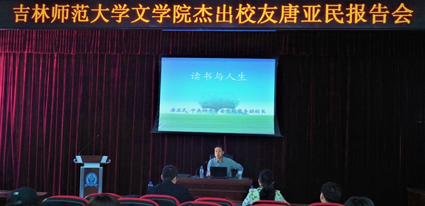为了让大学生学会读书,享受读书,从读书中感悟人生,201859日下午,文学院在十一教报告厅举办百名校友进校园活动,邀请文学院杰出校友四平市委党校常务副校长唐亚民做了《读书与人生》主题报告会。报告会由文学院院长肖振宇主持。文学院党委书记宋大伟、党委副书记肖钢,20162017级学生参加了此次报告会。